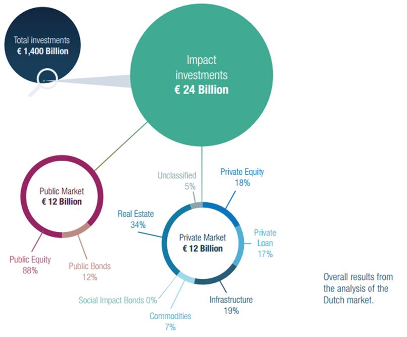 Bij alle typen impact investing draait het om het maken van investeringen die in de eerste plaats positieve maatschappelijke effecten als doel hebben. Een financieel rendement komt hierbij op de tweede plaats, hoewel het natuurlijk nog wel een reden is om aan impact investment te doen. Impact investments blijken dan ook een interessante bijdrage te kunnen leveren aan het oplossen van lastige maatschappelijke problemen. Het is een goede manier om op grote schaal kapitaal vrij te maken waarmee maatschappelijke veranderingen (impact) kunnen worden bewerkstelligd. Toch worstelt impact investing met het imago dat het een activiteit zou zijn voor filantropen en overheden. De VBDO denkt dat investeerders meer vertrouwd moeten raken met impact investing en de markt zich daarbij ook nog meer moet ontwikkelen voordat het echt kan gaan groeien. Ondernemingen zouden daarbij volgens J. Duiker, de schrijver van het rapport, ook meer transparant moeten zijn over hun maatschappelijke voetafdruk na een dergelijke investering. In Nederland zien de investeringscijfers in verhouding tot impact investments er als volgt uit: