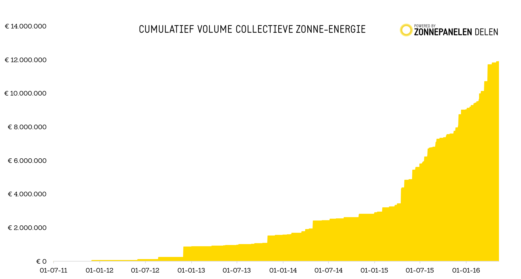 In het jaar 2015 is 6,1 miljoen euro opgehaald voor collectieve zonne-energie, een stijging van 370% ten opzichte van de 1,3 miljoen euro in 2014. De 69 projecten die zijn gefinancierd in 2015 is meer dan alle jaren daarvoor. In het eerste 4 maanden van 2016 staat de teller al op 2,7 miljoen euro. Met de 62 aangekondigde collectieve zonne-energieprojecten, die gemiddeld groter zijn in omvang, houdt deze steile groeicurve aan.