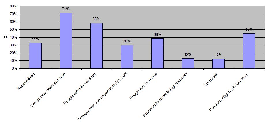 In het onderzoek kwam naar voren dat Nederlanders graag zelf (ingrijpende) beslissingen over hun pensioen willen nemen. Maar als Nederlanders de vraag krijgen welke aspecten ze het belangrijkste aan hun pensioen vinden, noemt 71% in elk geval een gegarandeerd pensioen. De hoogte van het pensioen (58%) is een goede tweede. Hieruit valt de conclusie te trekken dat men zekerheid belangrijker vindt dan meer geld. Opvallend is ook dat solidariteit en duurzaam beleggen (12%) erg matig scoren. In de leeftijdsklasse 18-30 jaar vindt men duurzaam beleggen wel wat belangrijker (16%) dan in hogere leeftijdklassen.