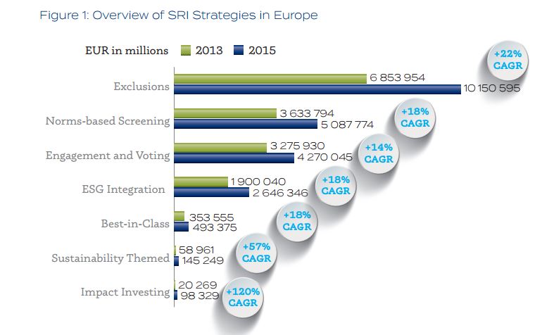 - Impact Investing is the fastest growing SRI strategy with €98 billion, up from only €20 billion in 2013.