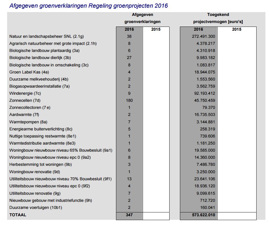 RVO heeft de jaarcijfers gepubliceerd over 2016 betreffende de groen beleggen regeling. Hieruit blijkt dat het aantal beleggers en spaarders is toegenomen met 9%. Het totale ingelegde vermogen in groen beleggen en spaarregelingen is echter met 5% afgenomen in 2016: van € 4.134 miljoen in 2015 naar € 3.925 miljoen.