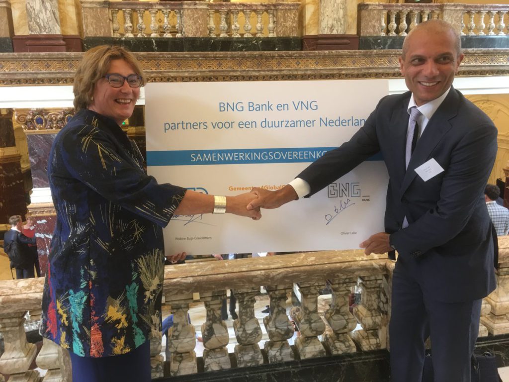 Olivier Labe van BNG Bank, en burgemeester Wobine Buijs-Glaudemans (gemeente Oss) van de VNG ondertekenden de overeenkomst op maandag 25 september ten overstaan van 450 vertegenwoordigers van bedrijven, overheden en politieke partijen tijdens de Impact Summit in het Koninklijk Instituut voor de Tropen in Amsterdam.