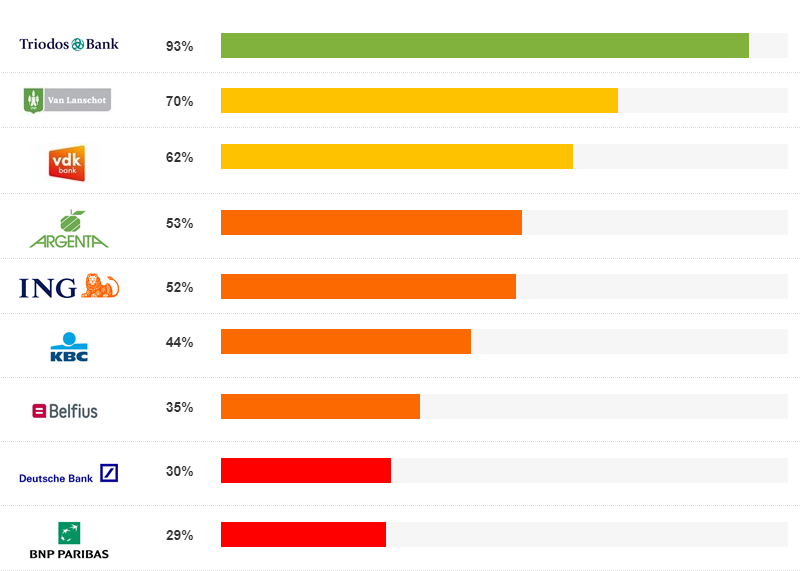 Alle banken, met uitzondering van Triodos Bank en in mindere mate Belfius en vdk bank, blijven heel slecht scoren op klimaat. KBC Bank publiceerde sinds de vorige update een nieuw beleid op energie waarbij financiering van steenkoolbedrijven voor een groot deel werd uitgesloten, maar maakt daarbij een belangrijke uitzondering voor Tsjechië, waar de bank nog wel veel investeert in opwekking van energie uit steenkool.