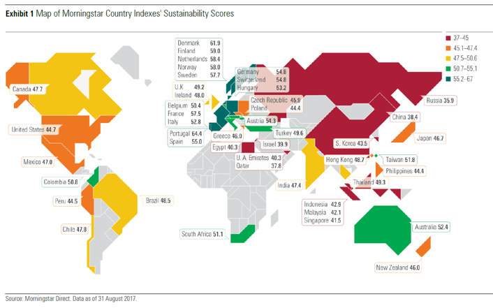 De 46 landen worden doorgelicht op hun duurzame prestaties aan de hand van de methodiek van de Morningstar Sustainability Rating. Ze krijgen een score op Environmental (milieu), Social (sociaal beleid) en Governance (goed ondernemingsbestuur) en vervolgens wordt daar een score voor controverses van af getrokken. Per land komt er een score uit rollen.