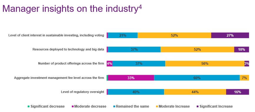 Uit het onderzoek is tevens gebleken dat er steeds meer aandacht is voor duurzaam beleggen. 78 procent van de onderzochte firma’s geeft aan dat hun klanten in toenemende mate belangstelling hebben om duurzaamheid en duurzaamheidsaspecten te laten meewegen bij de uitvoering van het portefeuillebeheer.”