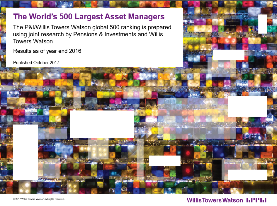 Het vermogen van de 500 grootste vermogensbeheerders ter wereld is in 2016 gestegen tot US$ 81,2 biljoen. Ten opzichte van 2015 betekent dit een stijging van 5,8 procent. Hoewel de meerderheid (78,4%) van het totale vermogen(1) nog steeds actief wordt beheerd, is dit aandeel verder afgenomen. Eind 2015 lag dit percentage nog op 79,7 procent. De populariteit van passief beheer blijft daarmee groeien. Ook de aandacht voor duurzaam beleggen bij klanten groeit. Zo blijkt uit de recentste cijfers van het jaarlijkse P&I/Willis Towers Watson Global 500-onderzoek, uitgevoerd door Willis Towers Watson in samenwerking met Pensions & Investments, een toonaangevende Amerikaanse nieuwsbron over beleggen.
