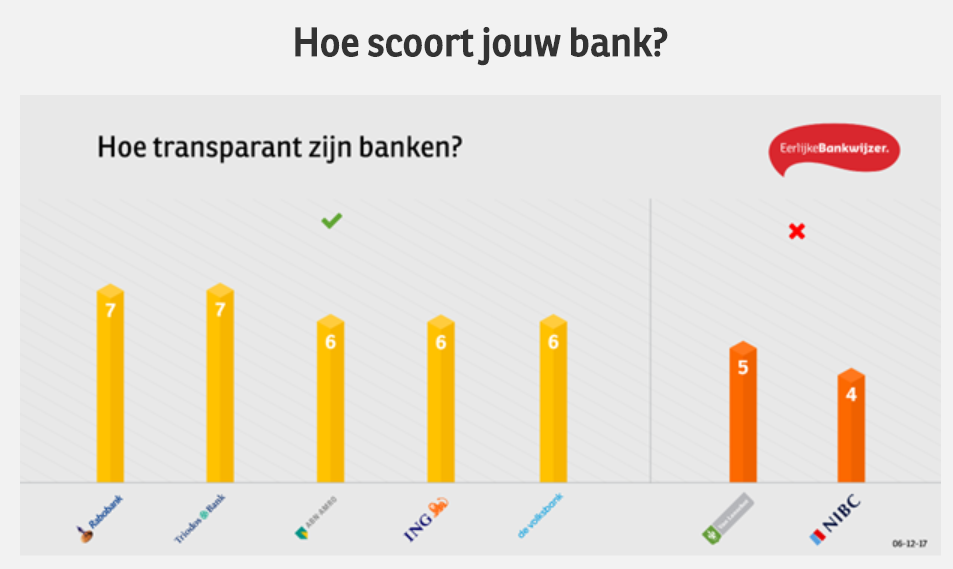 te worden over uitvoering van financieringsbeleid en financieringskeuzes. We zien dat banken vooruitgang boeken sinds de Eerlijke Bankwijzer dit onderzoekt – zo scoorden ABN Amro, ING en Rabobank in ons onderzoek in 2013 nog een 4 op transparantie. Het is te vroeg om de bankensector ’transparant’ te noemen, maar we zien nu wel dat de mist wat optrekt.”