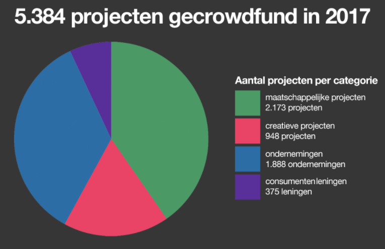 Ondernemingen haalden in 2017 maar liefst 192,7 miljoen euro op via crowdfunding, met als gemiddeld succesvol opgehaald bedrag 102.000 euro. Voor creatieve projecten, zoals film, muziek en theater, bedraagt het totaal opgehaalde bedrag 14,4 miljoen euro en het gemiddelde bedrag per project was 15.000 euro. Voor maatschappelijke projecten, zoals een speeltuin of schoolproject, is het totaal opgehaalde bedrag 13,1 miljoen euro en het gemiddelde bedrag per project 6.000 euro. Consumenten die via crowdfunding een persoonlijke lening financierden voor bijvoorbeeld de aanschaf van een auto of uitbouw van hun huis, haalden in totaal 2,8 miljoen euro op, met als gemiddeld bedrag 7.500 euro.
