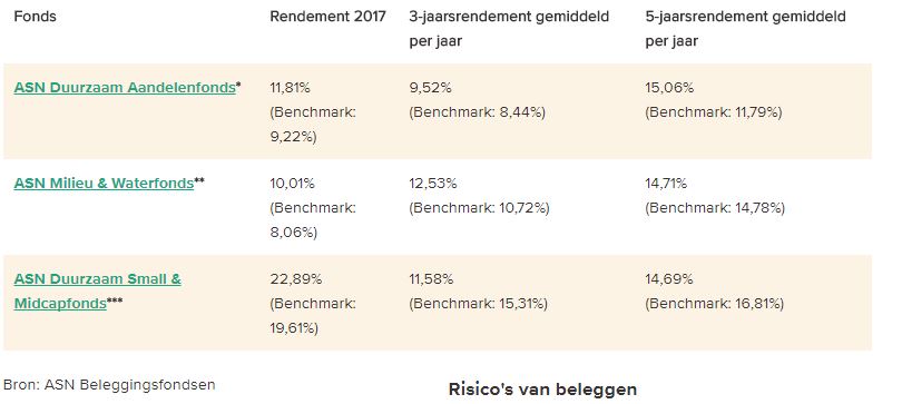 - ASN Aandelenfonds: de selectie van bedrijven op grond van duurzaamheid droeg positief bij. Een aantal niet-duurzame sectoren, zoals fossiele brandstoffen en financiële dienstverleners, waarin het fonds niet belegt, presteerde in 2017 minder dan duurzame sectoren. Met name het grote belang in de technologie sector zorgde voor de goede prestatie. Daarnaast zorgde de financiële selectie door de portefeuillemanager voor extra rendement.