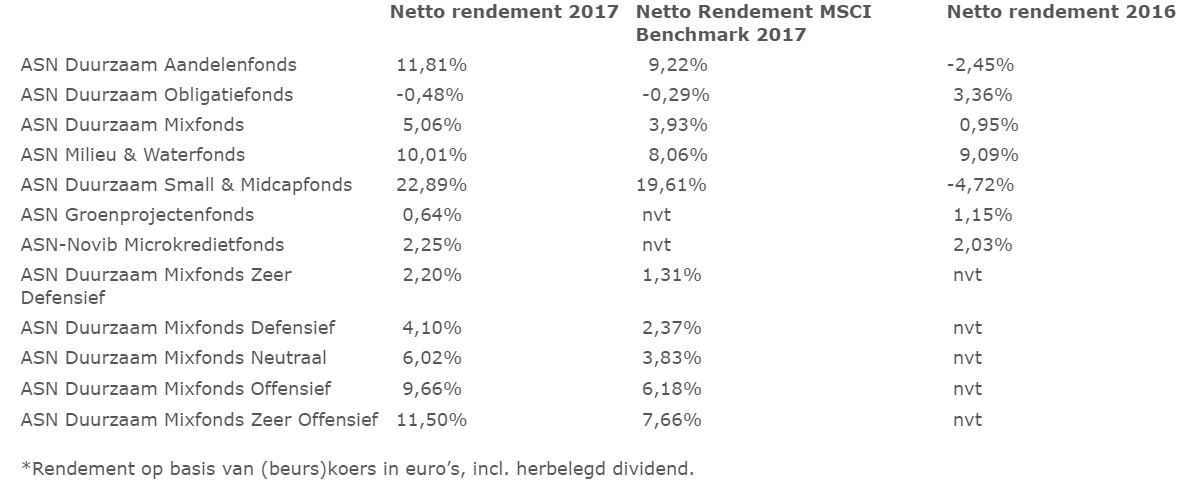 “Beleggen in duurzame bedrijven is geen idealisme, maar economische noodzaak.”, aldus Bas-Jan Blom, directeur van ASN Beleggingsfondsen. “Wij kiezen voor bedrijven die vooruitkijken en op innovatieve wijze bouwen aan de toekomst. Bijvoorbeeld geen industrieën als olie en gas. Maar wel bedrijven met goed beleid op gebruik van grondstoffen. En dat rendeert, alle ASN aandelenfondsen presteerden in 2017 beter dan de benchmark.”