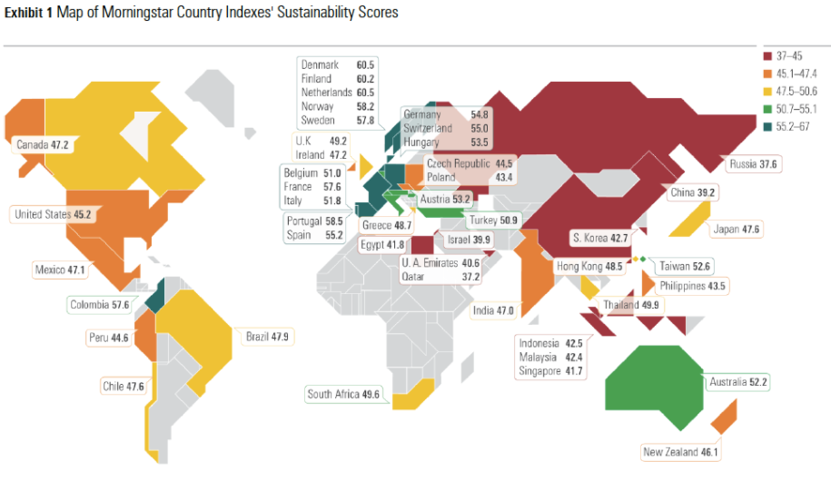 Uit de update blijkt verder dat duurzaamheid niet alleen een onderwerp is voor rijke landen. Ook sommige opkomende landen doen niet onder voor Europese landen: ze weten net zo’n hoog duurzaamheidsniveau te halen. Dat geldt bijvoorbeeld voor Colombia, dat als hoogst scorende niet-Europese land in het bovenste kwintiel uitkomt. Dat is te danken aan bedrijven als Bancolombia, Ecopetrol en Grupo Sura.