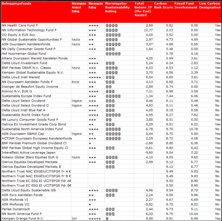 Onderstaande tabel rangschikt de beleggingsfondsen die verkrijgbaar zijn in Nederland naar Carbon Risk Score: de kolom met de Carbon Risk Score bepaalt de volgorde van de lijst.