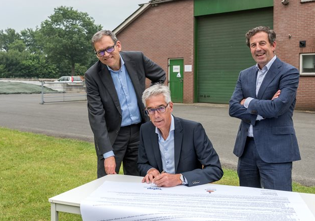 Fotobijschrift: vlnr Ruud Huirne, directeur Rabobank Food & Agri; Jelle Hannema CEO Vitens; Dick van den Oever, directeur Landelijk Vastgoed a.s.r.