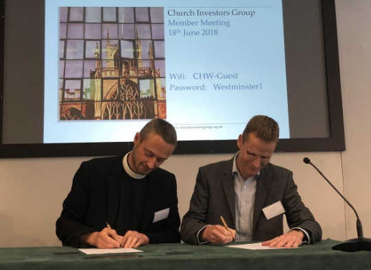 Afgelopen maandag ondertekenden Revd Canon Edward Carter, voorzitter van de Church Investors Group (CIG) en Koert Jansen, directeur van De Nieuwe Beurskoers, een samenwerkingsovereenkomst. De ondertekening vond plaats tijdens een CIG ledenbijeenkomst in het Church House Westminster in Londen.