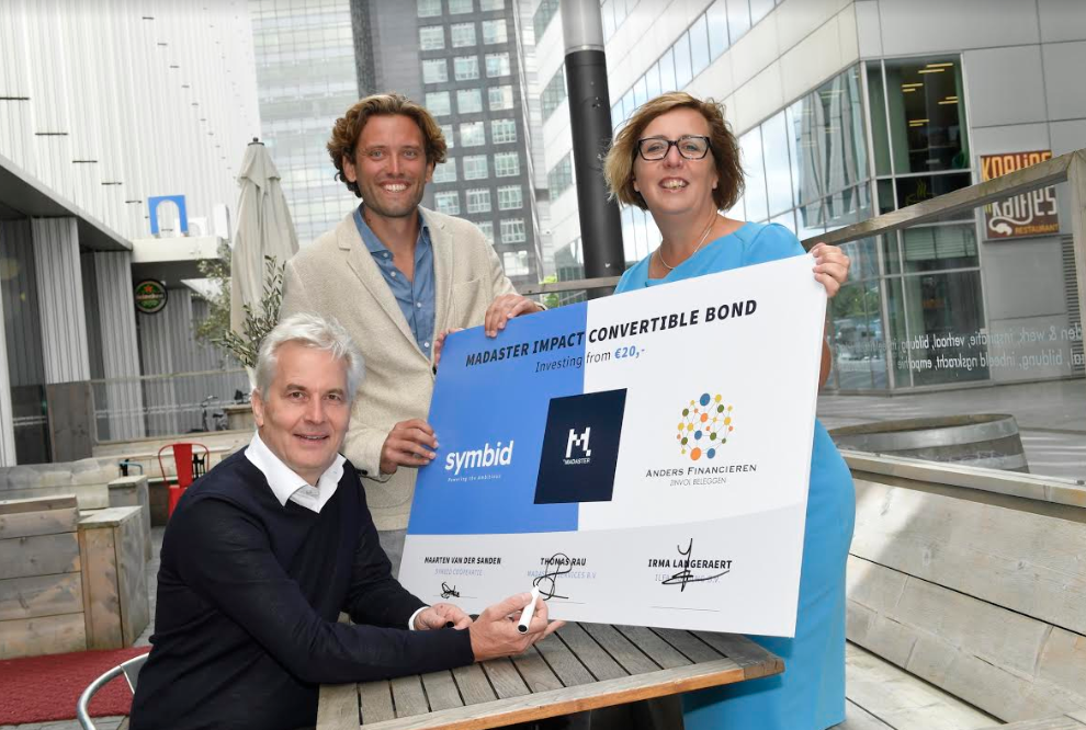 Rau: “Het is tijd dat particulieren meedoen en zo een grotere verantwoordelijkheid voelen om materialen te hergebruiken. We beschouwen de aarde als een gesloten systeem waarbinnen geen verspilling mag plaatsvinden. Grondstoffen zijn gelimiteerd en schaars voorhanden. Particulieren kunnen met deze constructie mede-eigenaar worden van Madaster. Bovendien is de financiering hiermee niet afhankelijk van alleen grote investeerders.” Thomas Rau kreeg de symbolische converteerbare obligatie aangeboden door Irma Langeraert van AndersFinancieren en Maarten van der Sanden van Symbid. Met de Madaster Convertible Impact Bond zal minimaal €500.000 en mogelijk €2,5 mln worden opgehaald aan financiering.