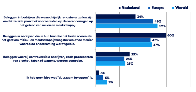 Daar waar beleggers in Europa en elders in de wereld duurzaam beleggen voornamelijk definiëren als beleggen in bedrijven die waarschijnlijk winstgevender zijn omdat ze zich beter voorbereiden op veranderingen in milieu en maatschappij, zijn Nederlandse beleggers veel minder overtuigd van die specifieke meerwaarde. Dit weerhoudt de Nederlandse belegger er echter niet van duurzaam te beleggen.
