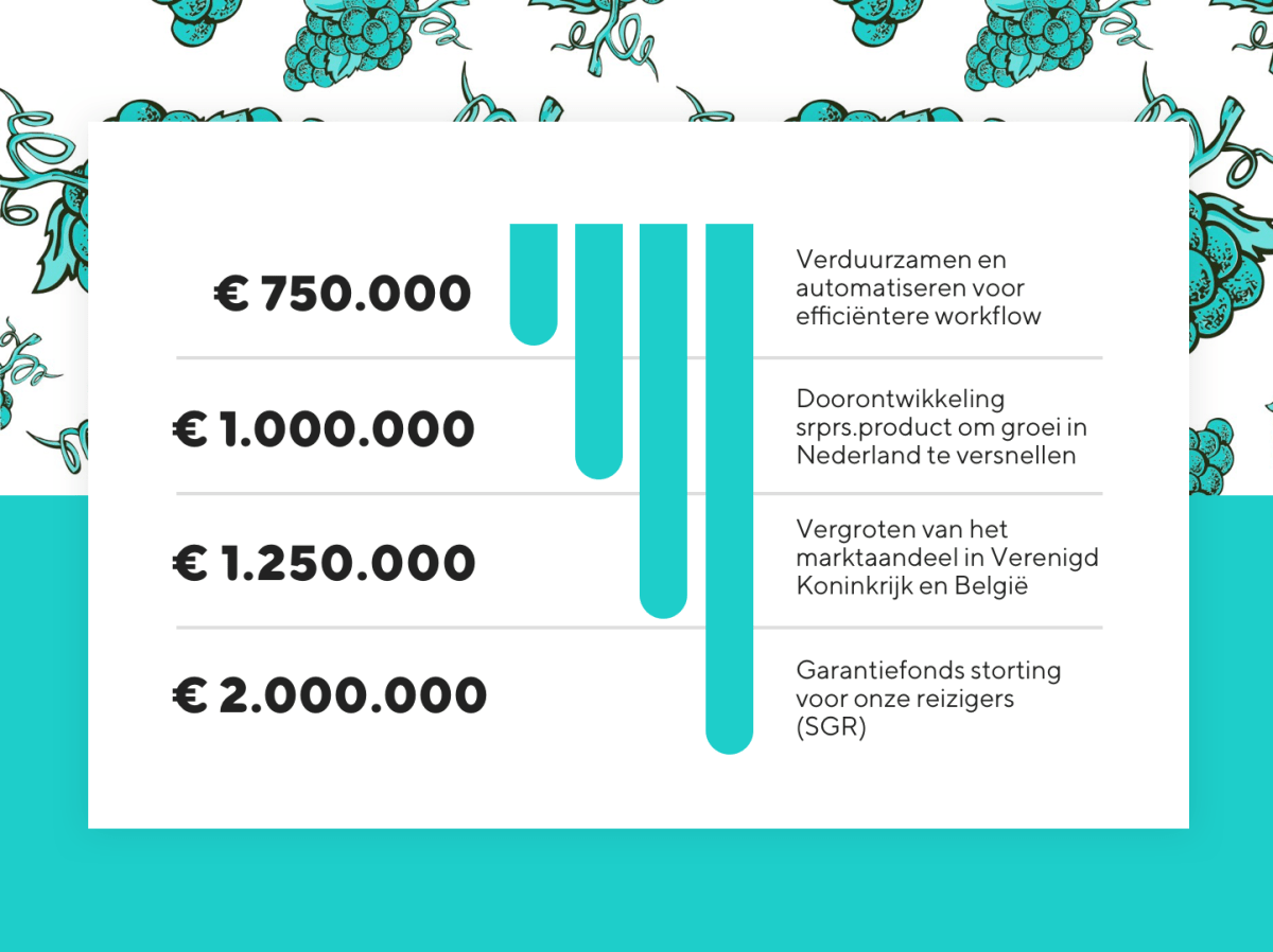 Voor het realiseren van alle srprs.doelstellingen willen we maximaal twee miljoen euro nieuw geld ophalen. Deze investering gebruiken we in eerste instantie voor het verduurzamen van onze reizen en voor het versnellen van onze groei.