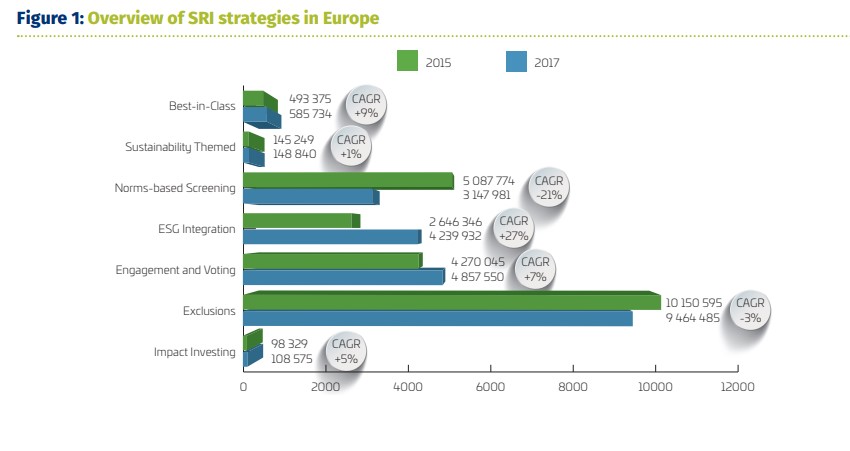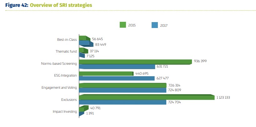 This is a very positive record, marked at over €4 trillion of assets under management, which indicates that almost every asset manager that responded to the survey implements some form of ESG integration. Engagement and Voting gains further ground as the strategy grows by 14% giving evidence of the renewed commitment of investors to interface with the companies in their portfolios and truly reach out to make a difference. This positive engagement translates into less appetite for more dogmatic approaches.