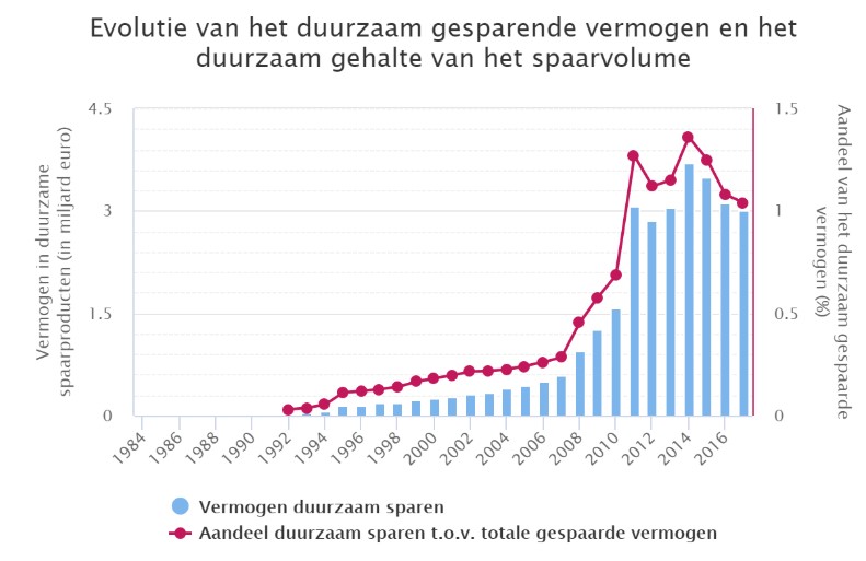 Zo lijkt het recordniveau van 3,7 miljard euro in 2014 steeds verder buiten bereik. Aangezien de Belgische spaarvolumes blijven stijgen, betekent dit eveneens een daling van het duurzaam gehalte in het spaarvolume. Dit daalde van 1,08% in 2016 naar 1,04% in 2017.