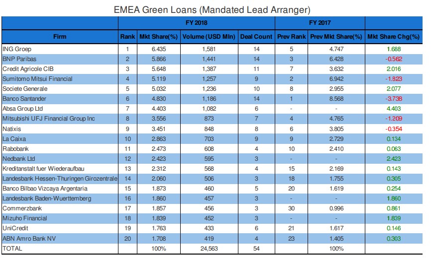 BNP Paribas was top of Bloomberg’s inaugural green loans league table for Europe, Middle East and Africa last year as sustainable finance volumes are rising. The French bank was the number one book runner with a market share of 12.8% last year, an increase of 9.2% from 2017, with five deals totalling $1.2bn (€1.5bn) according to Bloomberg. Spain’s Banco Santander was in second place with a market share of 10.5% and deal volume of $986m, a decrease of 3.1% market share since the same time last year. Dutch ING Group was third with a share of 7.1% and a deal volume of $668m. ING was the number one mandated lead arranger in 2018.