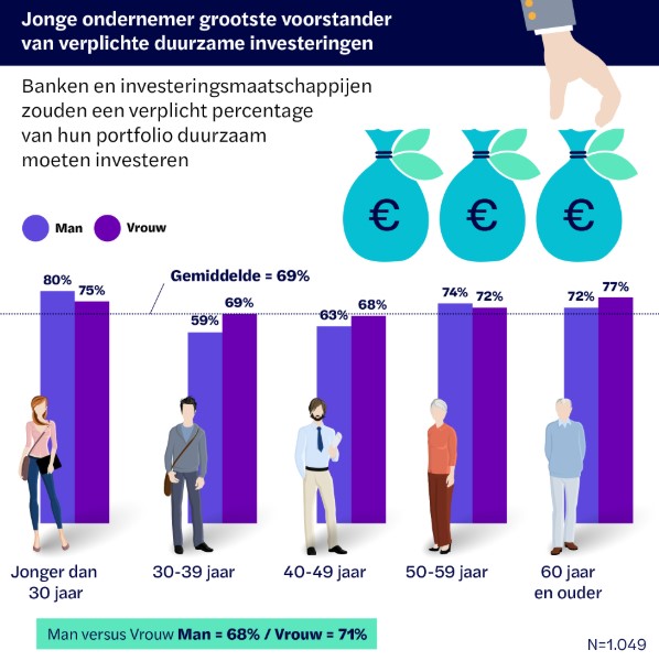 50 procent van de Nederlandse MKB-ondernemers vindt dat ze van de bank te weinig steun krijgen om te verduurzamen. Dit terwijl bijna tweederde wel bereid is een deel van de omzet te investeren in duurzaamheid. Dit blijkt uit een onderzoek van MKB-financieringsplatform October onder 1.059 Nederlandse MKB-ondernemers. Maar liefst 69 procent van hen vindt dat banken en investeringsmaatschappijen verplicht moeten worden een percentage van hun portfolio duurzaam te investeren.