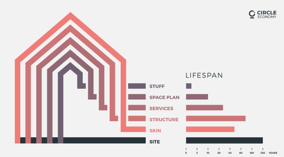 Het rapport stelt dat elk gebouw moet worden gezien als zes afzonderlijke bouwlagen, elk met een eigen levensduur. Door circulaire principes toe te passen kunnen strategieën worden ontwikkeld om de waarde van elke laag zo lang mogelijk te behouden.