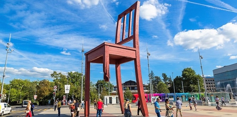 Image: the “Broken Chair” by Swiss artist Daniel Berset in Geneva, symbolizing the victims of landmines and cluster munitions.