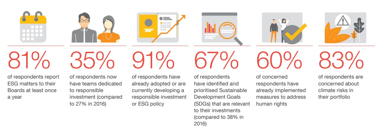Naast de ESG worden ook steeds vaker Sustainable Development Goals (SDGs) meegenomen in investeringsbesluiten. Twee derde (67%) van de respondenten heeft voor zijn investeringen inmiddels SDGs vastgesteld en geeft daar prioriteit aan (tegenover 38% in 2016) en 43% hanteert een proactieve aanpak als het gaat om het monitoren en rapporteren van de prestaties van de bedrijven in het portfolio aan de hand van de SDGs, tegenover 16% in 2o16.