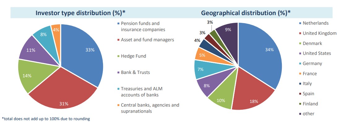 Bij deze cut-off spread is 82,5% van de biedingen van ‘green real money’ investeerders toegewezen, 72,5% van de biedingen van ‘real money’ investeerders en 18,5% aan ‘other’ accounts’. Van de totale toewijzing gaat 28,5% naar ‘green real money’ investeerders, 47,0% naar ‘real money’ investeerders en 24,5% naar ‘other’ investeerders.