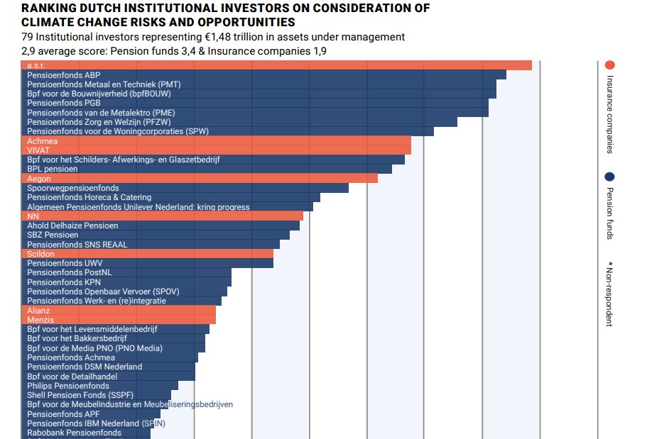 Onderlinge verschillen tussen institutionele beleggers zijn groot. De 10 grootste institutionele beleggers scoren gemiddeld een 7.8, en de pensioenfondsen (3,4) scoren gemiddeld iets beter dan de verzekeraars (1,9).