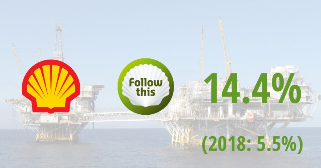 Steeds meer beleggers vragen Shell om klimaatactie in plaats van een vrijblijvende ambitie voor 2050. De Follow This klimaatresolutie kreeg vandaag 14,4 % van de stemmen (omhoog van 5,5% in 2018), zo maakte het bedrijf bekend na de besloten aandeelhoudersvergadering. Van de andere 20 resoluties kregen de meeste meer dan 99%.