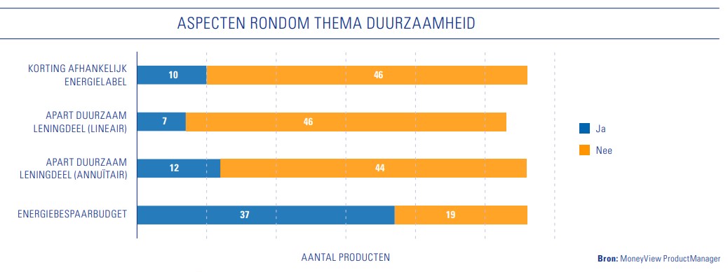 Bij 10 hypotheken is er inmiddels een dergelijke rentedifferentiatie. Een 11e product geeft korting op de hoofdhypotheek als er ook een apart duurzaam leningdeel wordt afgesloten. Andere aspecten rondom het thema duurzaamheid zijn bijvoorbeeld het Energie Bespaar Budget (EBB) en de reeds eerder genoemde apart af te sluiten duurzame leningdelen. Met name het vergroten van de duurzaamheid van de woning na aanschaf, in de vorm van een EBB, is bij veel producten mogelijk. Dit geldt in mindere mate voor de andere twee duurzaamheidsaspecten (zie onderstaande figuur).
