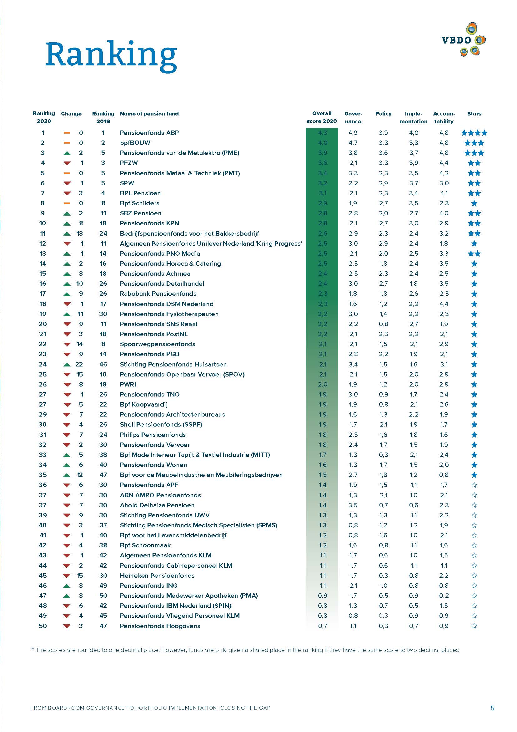 Jaarlijks onderzoekt de Vereniging van Beleggers voor Duurzame Ontwikkeling (VBDO) de prestaties van het verantwoord beleggingsbeleid van Nederlandse pensioenfondsen, met steun van FNV. De benchmark beoordeelt de 50 grootste pensioenfondsen van Nederland, samen goed voor 92% van het beheerd vermogen met een totale waarde van meer dan €1.435 miljard. Uit het uitvoerig onderzoek komen ook de prestaties van de sector als geheel naar voren. Hieruit blijkt onder andere dat er op het gebied van beleid al flink stappen zijn gemaakt de afgelopen jaren, maar er nog te winnen valt in de vertaling naar praktijk. Ook dit jaar is ABP voor het derde jaar het hoogst scorende pensioenfonds met een score van 4,3 uit een maximum van 5.
