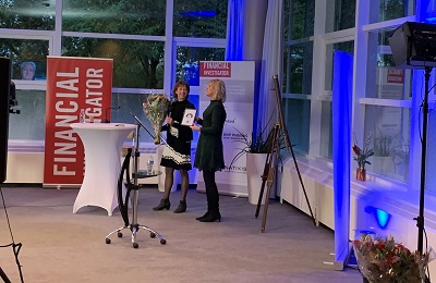 Foto: Angélique Laskewitz (algemeen directeur van de VBDO) reikt de prijs uit aan Geraldine Leegwater (bestuurslid ABP).
