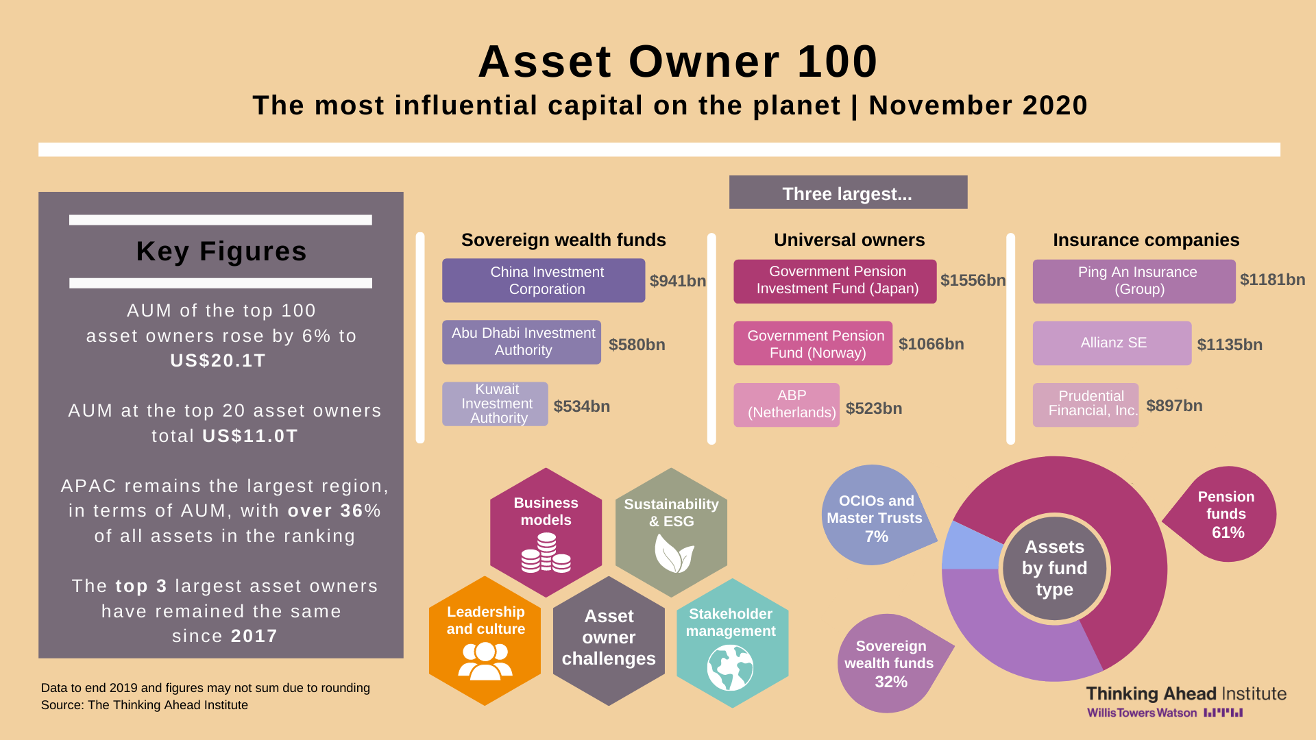 The Asset Owner 100 (AO100) – the world’s 100 largest asset owners grew by 6% last year to reach over US$20 trillion, according to research from the Thinking Ahead Institute (TAI). Pension funds remain the single biggest group of asset owners accounting for over 60% of assets, followed by sovereign wealth funds (32%) and Outsourced Chief Investment Officers (OCIOs) and Master Trusts combined (7%). According to the research, the AO100 have become more prominent in integrating ESG and being more active owners, including aiming for real-world impacts in their investment strategies.