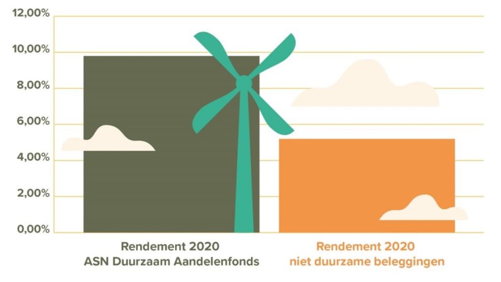 Het ASN Duurzaam Aandelenfonds behaalde over 2020 een rendement van 9,8%. Dat is 4,6% meer dan MSCI All Country World Index, de wereldwijde vergelijkingsmaatstaf van het fonds met zowel duurzame als niet-duurzame bedrijven erin. Deze index kwam uit op een jaarrendement van 5,2%.