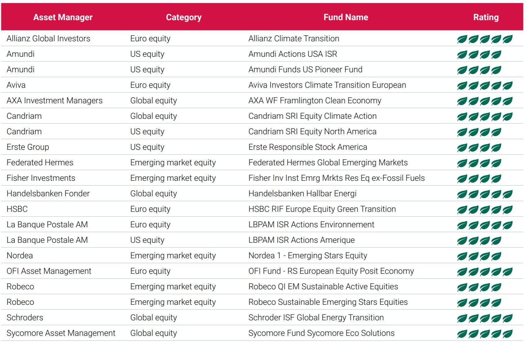 All top-rated (5-leaf) funds are run by asset managers demonstrating strong climate action through participation in collective corporate engagement initiatives and good climate-related disclosure.