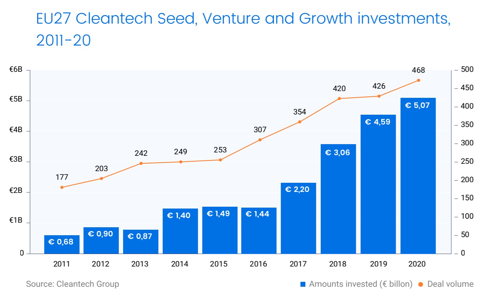Newly-published research from Cleantech Group®, the global authority on clean technology innovation, with the support of Breakthrough Energy, found the EU’s venture capital investment into cleantech from 2011-2020 grew by a remarkable 7.5x to more than EUR 5 billion in 2020. But research also discovered progress is concentrated on early-stage development and lacks scale-up investment and policy support. The EU attracted 23% of global cleantech seed-stage funding in 2020, but only 7% of global cleantech growth equity funding (compared to 54% for North America). The EU risks missing key climate targets by failing to scale clean technologies and letting promising innovators scale in North America and Asia instead.