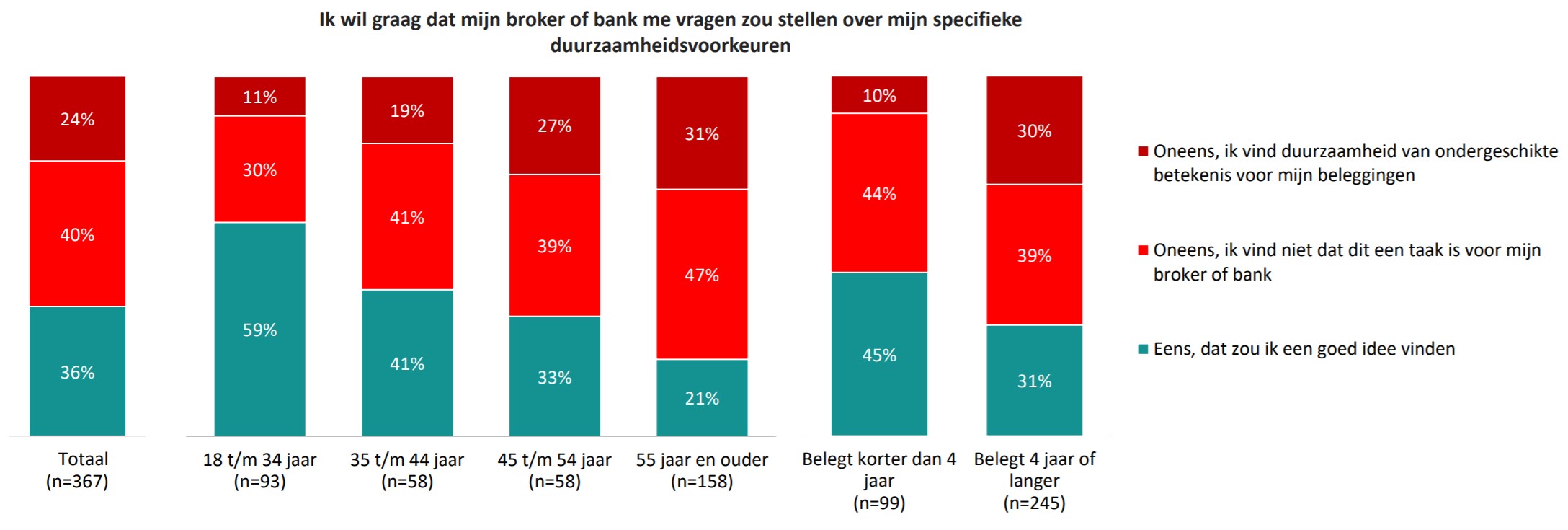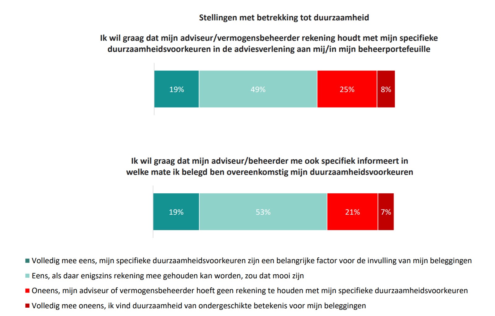 Duurzaamheid is voor veel beleggers een belangrijk aspect van hun portefeuille. Zeven op de tien (68%) beleggers die via een adviseur of vermogensbeheerder belegt, wil dat hier rekening mee wordt gehouden. Bij zelfstandige beleggers ligt dat iets lager. Voor beide groepen geldt dat beginnende beleggers meer waarde hechten aan duurzaamheid. Eveneens zeven op de tien (72%) wil dat zij ook specifiek geïnformeerd worden over de mate waarin hun portefeuille voldoet aan duurzaamheidsvoorkeuren. Slechts een op de 12 geeft aan dat zij duurzaamheid niet belangrijk vinden bij hun beleggingen. Ervaren beleggers geven dit vaker aan dan beginners.