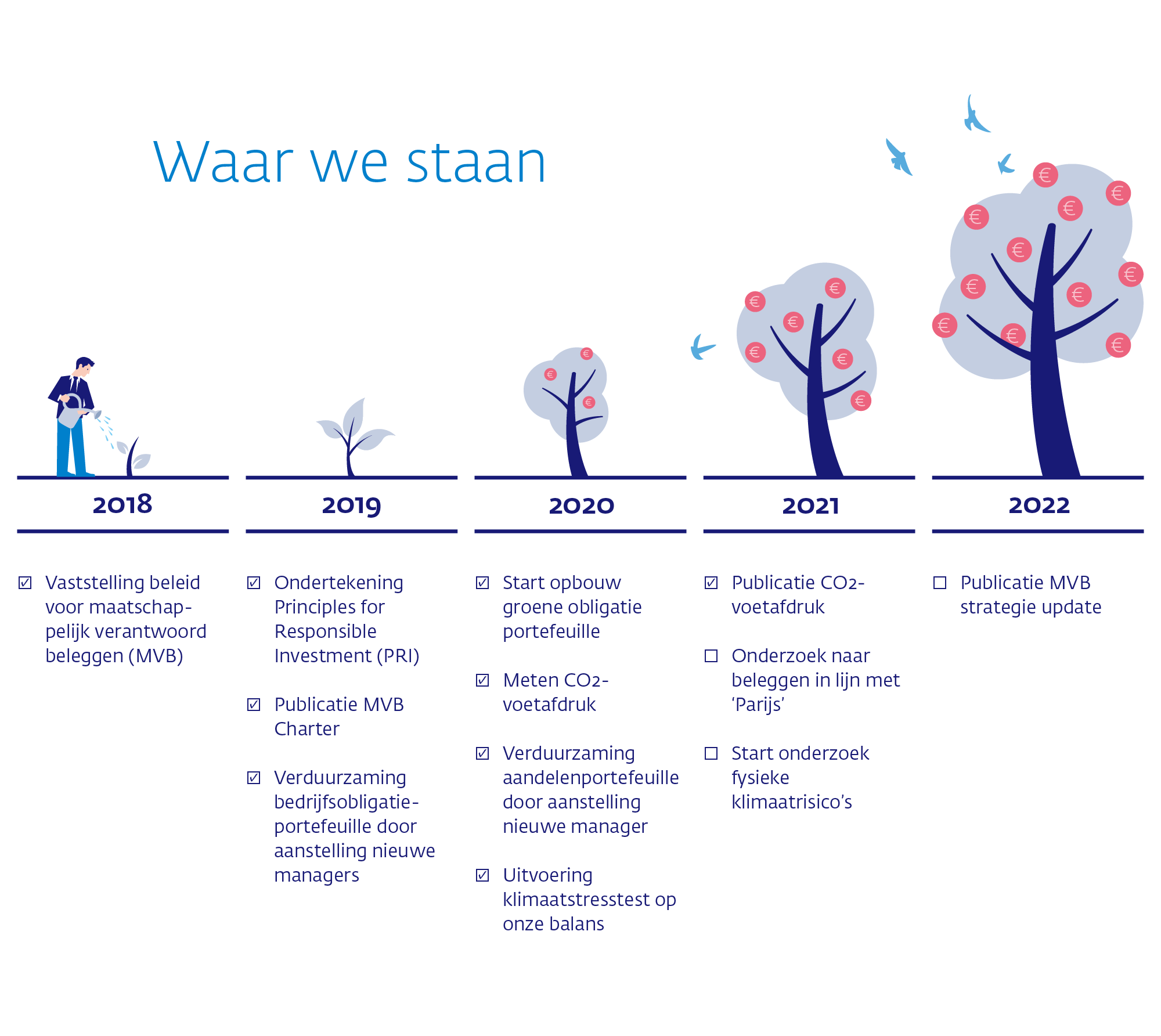 We verduurzamen onze beleggingen op basis van uitgangspunten die we in 2019 hebben geformuleerd en gepubliceerd in ons Charter Verantwoord Beleggen. Sindsdien hebben we een aantal belangrijke stappen gezet. Zo hebben we in 2019 twee nieuwe externe managers aangesteld voor het beheer van een deel van onze bedrijfsobligatieportefeuille. In 2020 hebben we ook een nieuwe manager aangesteld voor het beheer van een deel van onze aandelenportefeuille. Deze nieuwe managers voldoen aan onze uitgangspunten. Dit betekent dat ze ecologische, sociale en governance (ESG) criteria integreren in de beleggingsbeslissing, niet beleggen in producenten van controversiële wapens, en bedrijven screenen die de UN Global Compact principes schenden – en op basis hiervan de dialoog aangaan of uitsluiten. In ons jaarverslag lichten we uitgebreider toe (in hoofdstuk 4) welke stappen we in 2020 hebben gezet om onze beleggingen in lijn te brengen met het Charter. We zijn er bijna. Momenteel passen we onze operationele inrichting en systemen nog aan zodat meer maatwerk mogelijk is, en we de doelen uit ons Charter volledig kunnen verwezenlijken.