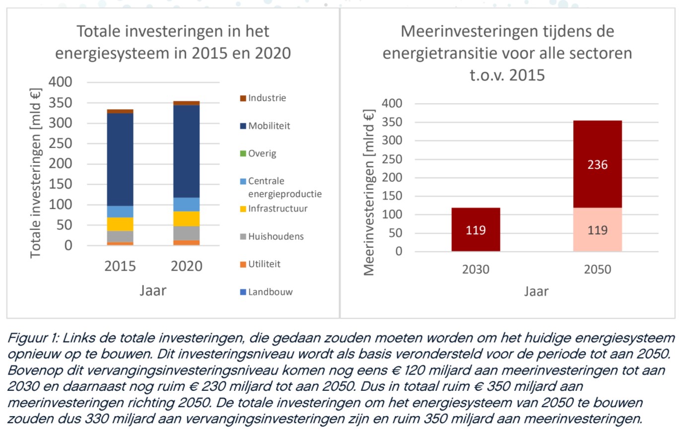 De benodigde meerinvesteringen in de energietransitie bedragen in de periode tussen 2015 en 2050 ruim € 350 miljard (zie Figuur 1). Daarvan is ongeveer € 20 miljard uitgegeven tussen 2015 en 2020. En er dient nog € 100 miljard te worden geïnvesteerd tussen 2020 en 2030. Gemiddeld moet er ongeveer €10 miljard extra per jaar worden geïnvesteerd tot aan 2050 naast de 10 miljard “vervangingsinvesteringen” per jaar die we als “basis” meekrijgen vanuit het huidige systeem.