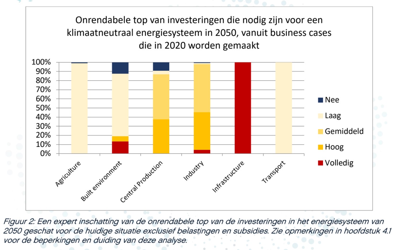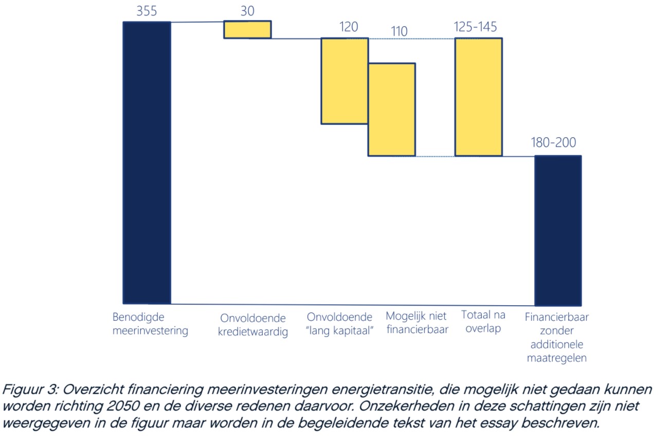 De adviesbureaus Kalavasta en Berenschot hebben in opdracht van het Ministerie van Economische Zaken en Klimaat (IBO werkgroep Financiering van de Energietransitie) een essay gepubliceerd over de financiering van de energietransitie. Daarbij waren er twee belangrijke vragen. Hoe hoog zijn de investeringen die gedaan moeten worden in de energietransitie en welke investeringen zijn onrendabel? De onderzoekers hebben daar op eigen initiatief een derde vraag aan toegevoegd: welke business cases, indien rendabel gemaakt door de overheid, zijn niet financierbaar? Uit het onderzoek blijkt dat van de €355 mrd die nodig is om in 2050 klimaatneutraal te worden, de helft niet gefinancierd kan worden. Zelfs niet als de overheid bijspringt met subsidie.