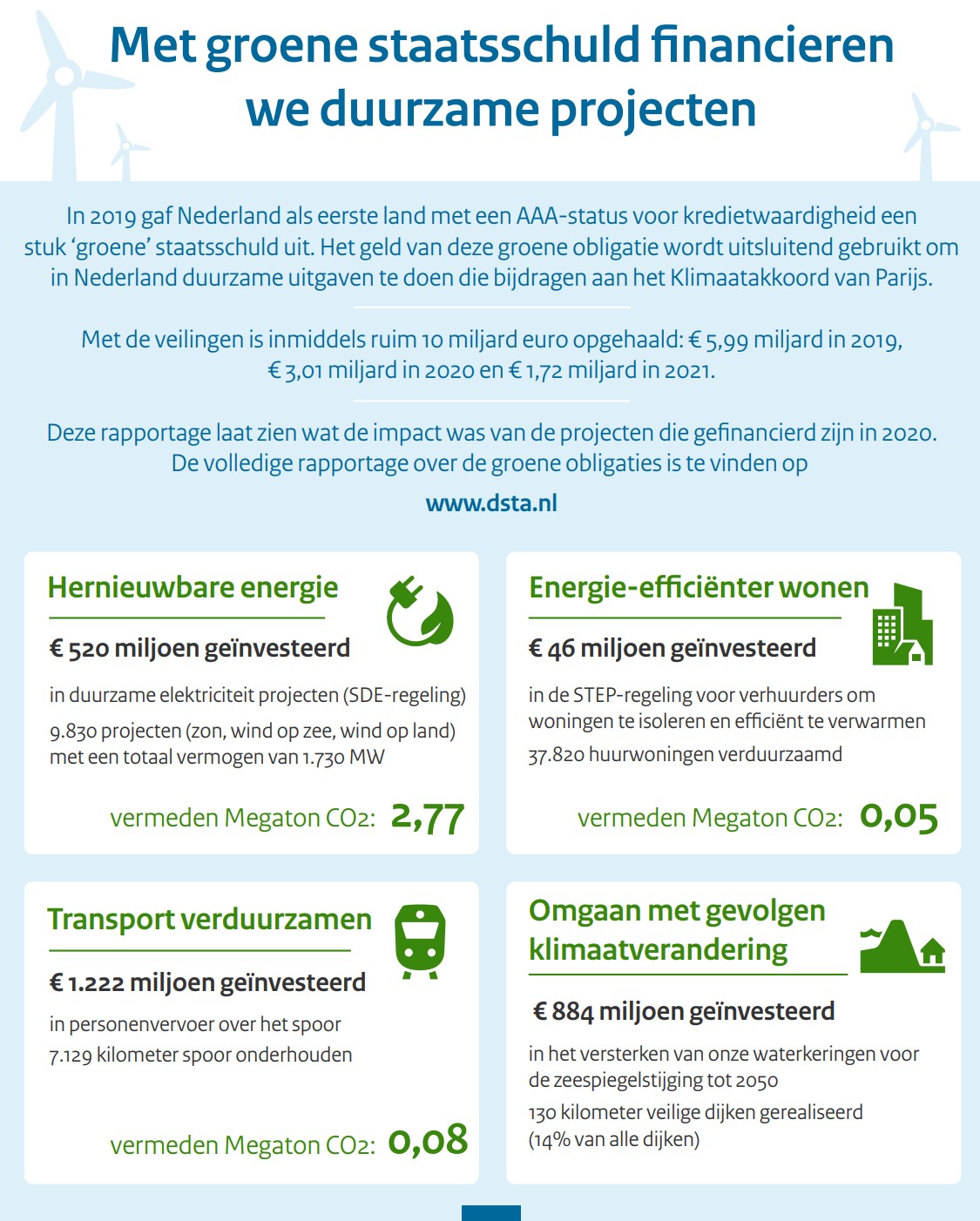 Nederland heeft in mei 2019 als eerste land met een triple-A rating een groene obligatie (groene DSL) uitgegeven waarbij € 5,98 mld. is opgehaald. In 2020 is met deze groene obligatie € 3,01 mld. opgehaald. In 2021 is een additioneel bedrag van € 1,72 mld. opgehaald met deze groene obligatie met deze groene obligatie. Daarmee is voor deze groene obligatie het doelvolume van minimaal € 10,0 mld. ruimschoots behaald.