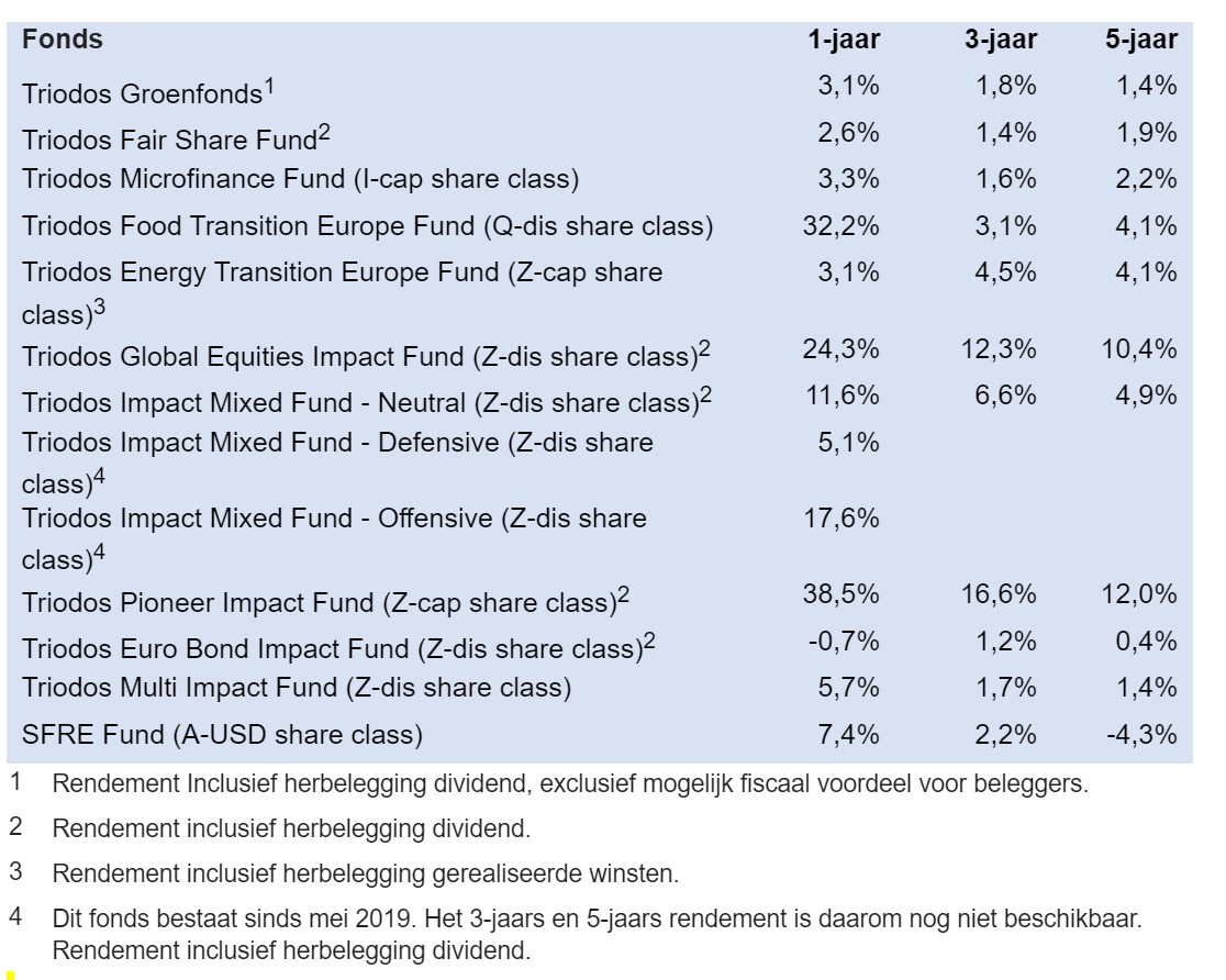 Bijna alle fondsen van Triodos Investment Management hebben rendementen gerealiseerd in lijn met of boven de verwachting. De Impact Equities and Bonds fondsen die beleggen in aandelen hebben geprofiteerd van een aanhoudende stijging van wereldwijde aandelenmarken. Triodos Food Transition Europe Fund heeft in het bijzonder geprofiteerd van een positieve herwaardering van de portefeuille waarmee dit fonds een zeer sterk resultaat heeft weten te realiseren in het eerste halfjaar.