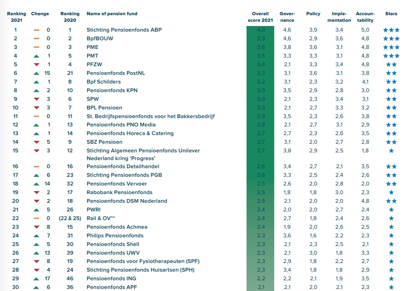 Jaarlijks onderzoekt de VBDO het verantwoord beleggingsbeleid en prestaties van Nederlandse pensioenfondsen, met steun van FNV. De benchmark beoordeelt de 50 grootste pensioenfondsen van Nederland, samen goed voor 89% van het beheerd vermogen met een totale waarde van meer dan €1.540 miljard. Ook dit jaar is ABP voor het vierde jaar op rij het hoogst scorende pensioenfonds met een score van 4,0 uit een maximum van 5.