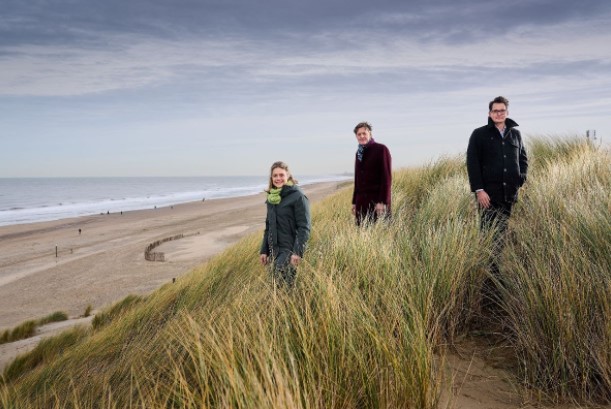 Foto: Van links naar rechts: Dorien Ackerman (Natuur & Milieu), Albert Jaap van Santbrink (Stichting De Noordzee) en Arie Koornneef (ASN Bank) bij de Wassenaarse Slag, waar zij het convenant ondertekenden om de biodiversiteit bij de (toekomstige) aanleg van windparken op zee te beschermen. Fotograaf: Phil Nijhuis.