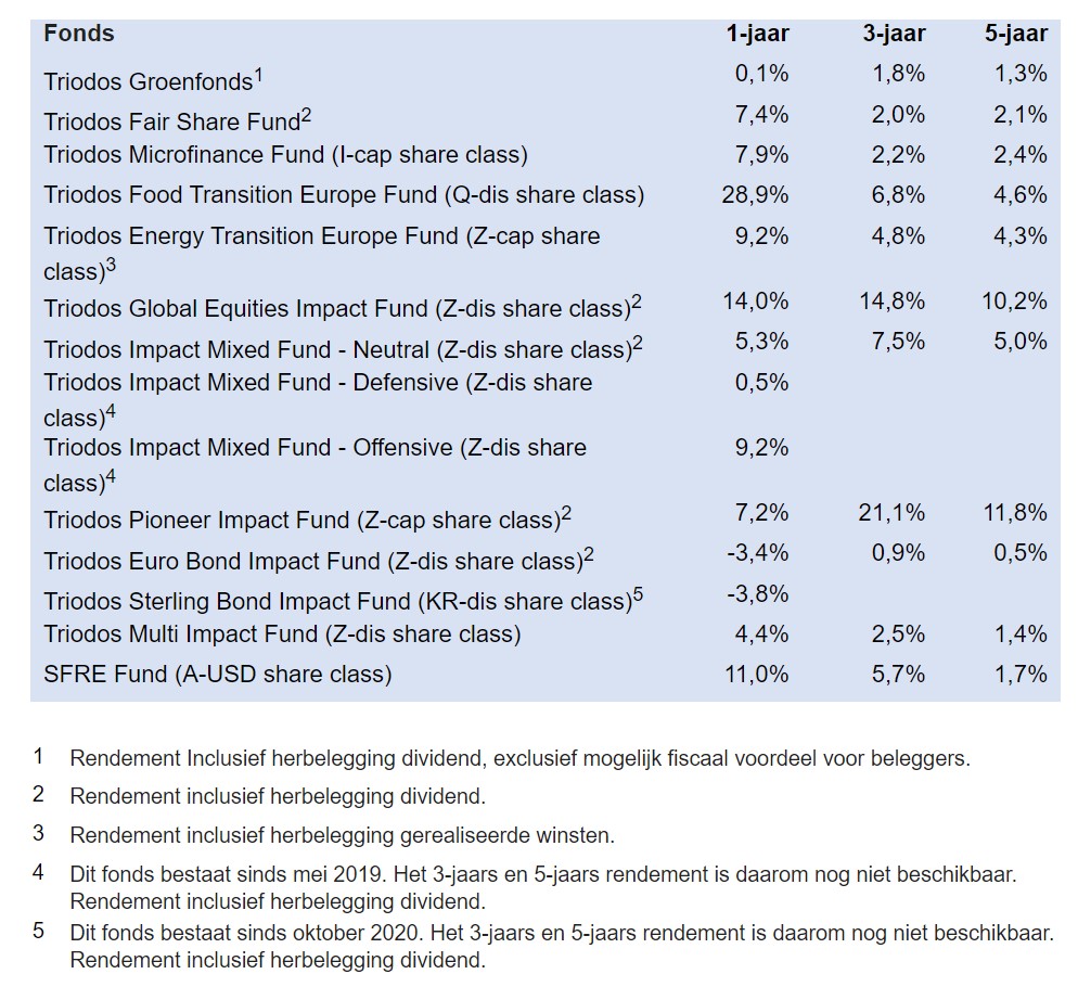 In 2021, het tweede jaar van de COVID-19-pandemie, presteerden de meeste Triodos fondsen goed en waren ze in staat om ondanks aanhoudend uitdagende omstandigheden een gezond rendement te behalen. Vooral de fondsen die beleggen in financiële instellingen in opkomende markten (Triodos Fair Share Fund en Triodos Microfinance Fund) waren in staat om de negatieve prestaties in 2020, als gevolg van de impact van de pandemie, om te zetten in solide rendementen in 2021. Dit resultaat onderstreept het veerkrachtige karakter van opkomende markten. Triodos Food Transition Europe Fund presteerde vorig jaar uitzonderlijk goed als gevolg van de exit uit een van haar portefeuillebedrijven. Triodos Euro Bond Impact Fund en Triodos Sterling Bond Impact Fund daarentegen moesten het jaar afsluiten met een negatief rendement van respectievelijk -3,4% en -3,8%. Dit was het gevolg van volatiele obligatiemarkten door stijgende inflatieverwachtingen en het begin van een strakker monetair beleid. Een dynamiek die impact heeft gehad op alle obligatie gerelateerde portefeuilles.