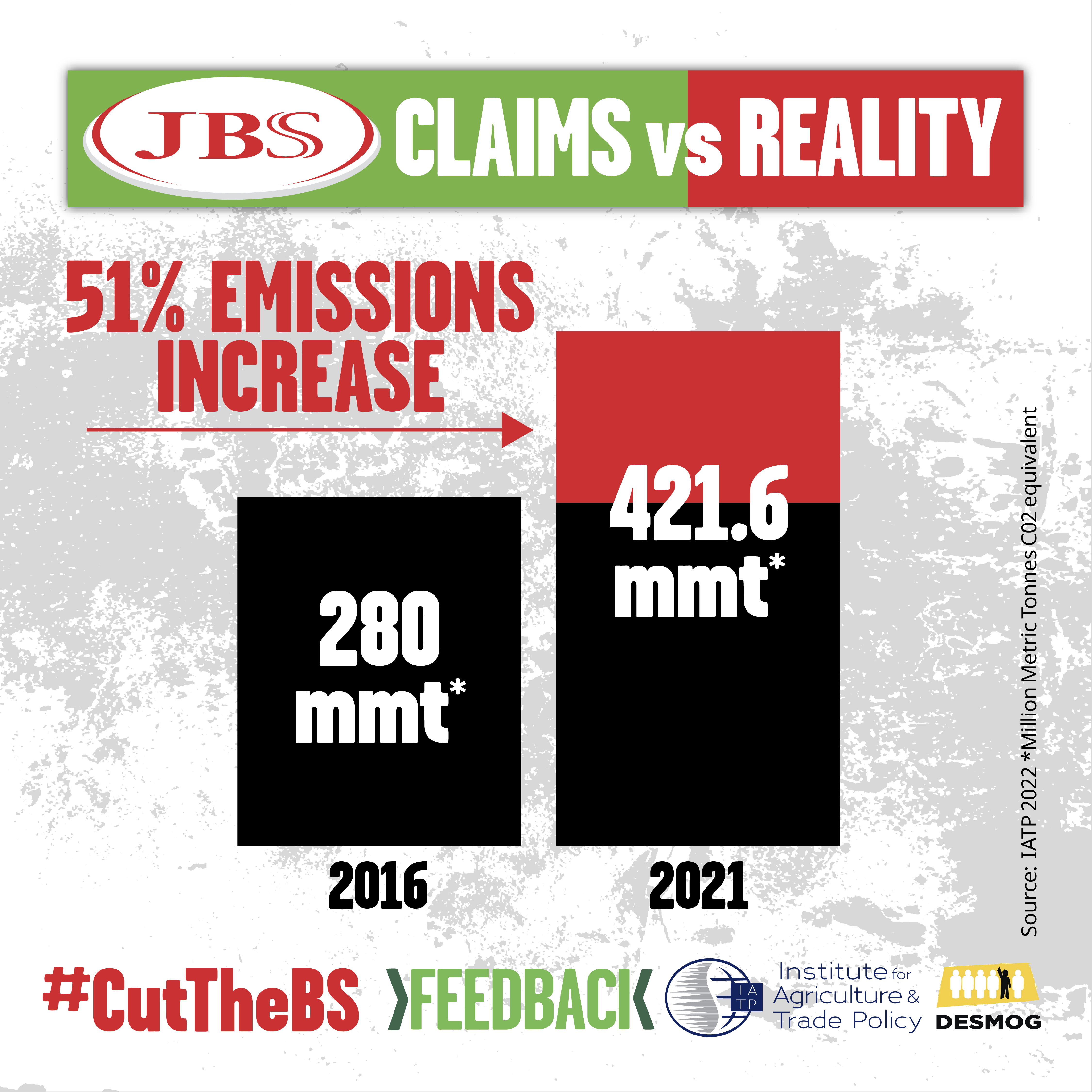 Een coalitie van actiegroepen – waaronder Feedback EU, IATP, Desmog en Mighty Earth – is woedend over de buitensporige uitstoot van JBS. In vijf jaar tijd heeft het bedrijf het aantal dieren om te slachten verhoogd naar 28 miljoen runderen (54% omhoog), naar 48 miljoen varkens (67% omhoog) en naar 5 miljard kippen (40% omhoog). Het is dan ook geen verrassing dat nieuw onderzoek van IATP, Feedback EU en Desmog op basis van een door de VN goedgekeurde methode laat zien dat de emissies tussen 2016 en 2021 met 51% is toegenomen, van 280 megaton tot 421,6 megaton CO2 equivalent. Dat is meer dan twee keer zoveel als de jaarlijkse uitstoot van Nederland en de helft van wat Shell elk jaar uitstoot.
