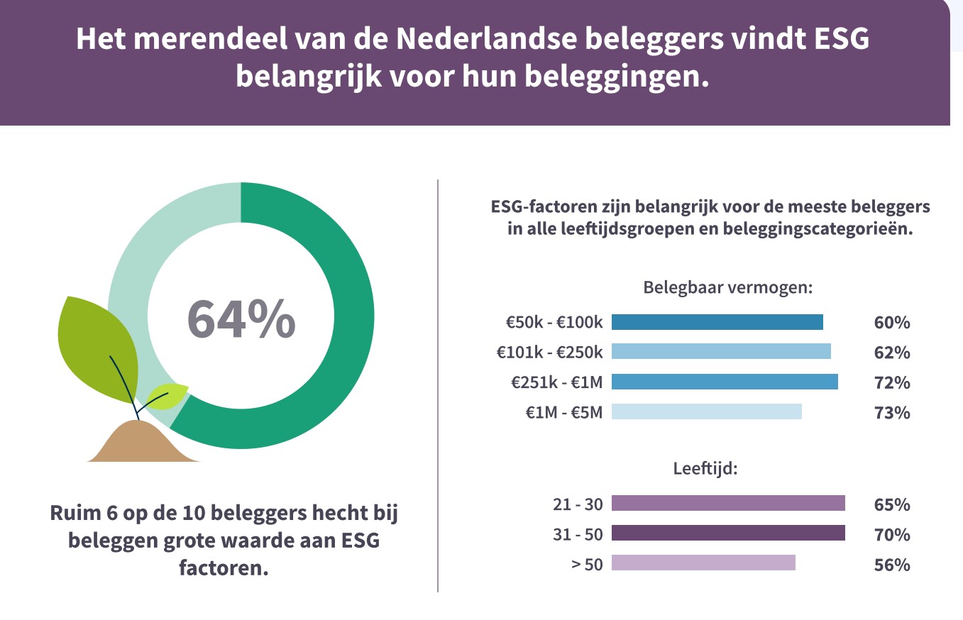 Ondanks de grote wereldwijde belangstelling voor ESG, is slechts een fractie van de beleggers ervan overtuigd dat hun portefeuille volledig is afgestemd op wat zij als belangrijke duurzaamheidsfactoren beschouwen. Wereldwijd worden beleggers zich steeds meer bewust van het belang van duurzame beleggingsdoelstellingen; onder Nederlandse beleggers geeft ongeveer tweederde (64%) aan ESG belangrijk of zeer belangrijk te vinden in hun beleggingsportefeuille, ongeacht het belegbare vermogen en de leeftijdsgroep.