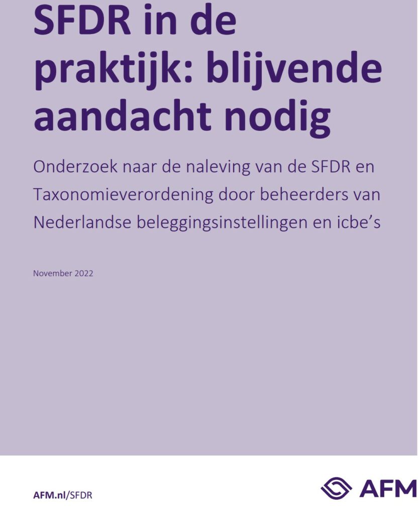 De AFM heeft drie onderzoeken uitgevoerd naar de toepassing van deze transparantieregels. Dit is gedaan bij banken, verzekeraars, pensioenuitvoerders, beleggingsondernemingen en beheerders van beleggingsfondsen. Daaruit blijkt dat de duurzaamheidsinformatie wel wordt verstrekt, maar over de hele linie begrijpelijker en concreter kan. Overall hebben kleinere partijen meer moeite om aan de regels te voldoen dan de grotere instellingen. Organisaties kunnen vaak nog niet aangeven of ze beleggen in activiteiten in lijn met de Taxonomie; dit is de Europese definitie van wat als groen kwalificeert.
